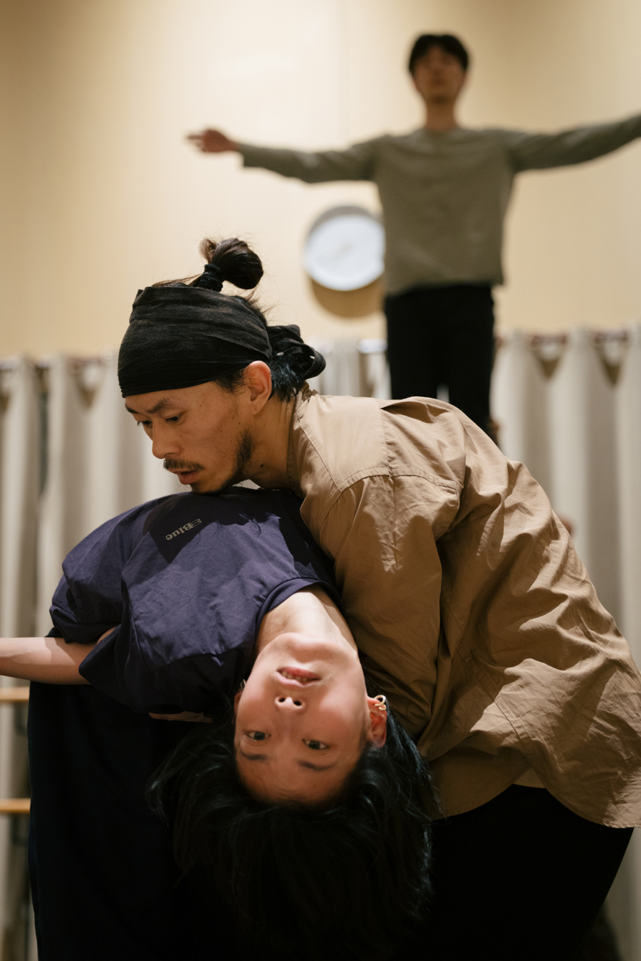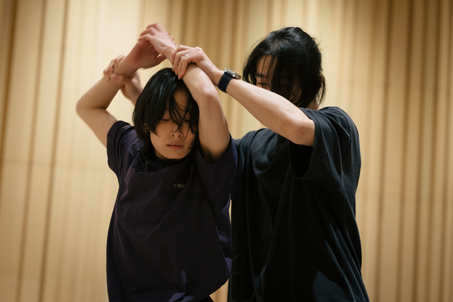 “现场演奏的意义在于让声音与身体保持即时互动。观众所听到的,不是‘播放’,而是‘正在发生’。”作曲王懿选择采用现场演奏的MIDI电子乐与实时拟声,合成器根据演员的动作现场触发音效,接触式麦克风捕捉细微声音,鼓、木鱼与电子打击乐共同构成多重声音结构,“这种声音结构看似复杂,实际上让表演变得更加自由。音乐不再要求演员卡点,而是根据身体的呼吸与节奏实时生成。”