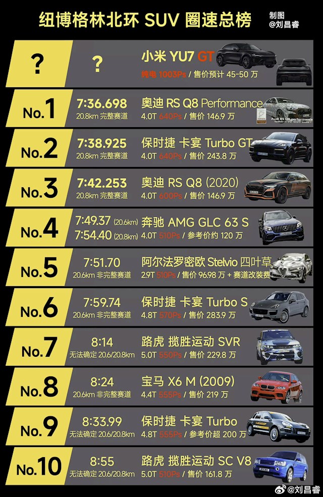 而此次无伪装上阵赛道测试,其核心目标也十分明确,即冲击“纽北最速SUV”的头衔。目前纽北SUV圈速榜中,奥迪RSQ8以7分36秒6的成绩稳居前列,保时捷卡宴TurboGT同样是该榜单的硬核标杆。